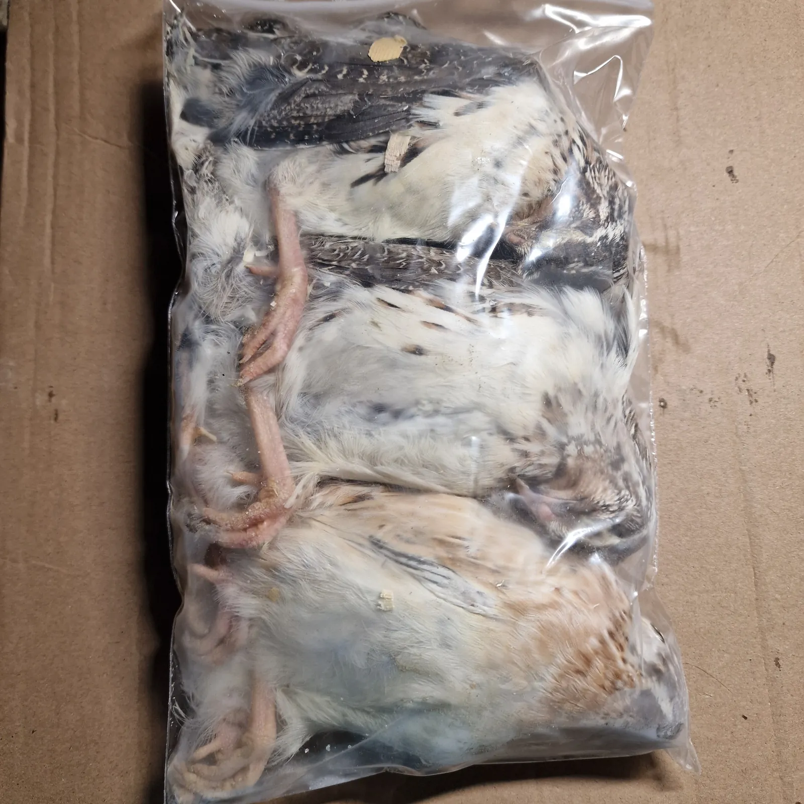 Prémium minőségű, gondosan válogatott fagyasztott fürj, ideális táplálék kígyók, nagyobb gyíkok és ragadozó madarak számára.