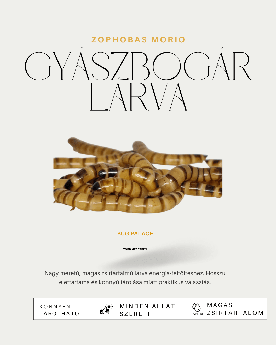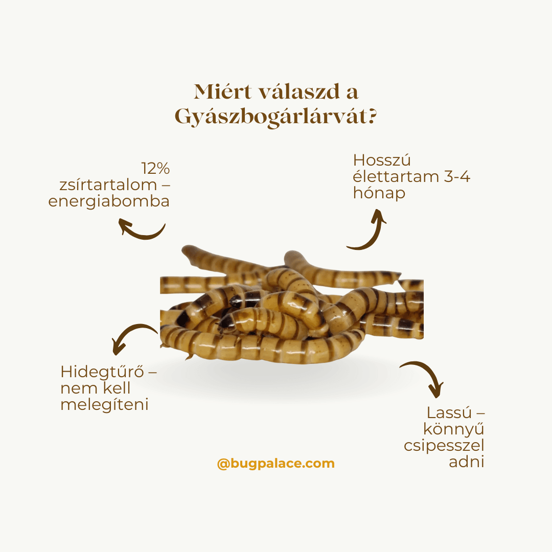 Nagyobb méretű, mozgékony lárva, ezért kiválóan serkenti a vadászösztönt, és magas fehérjetartalma miatt ideális energiapótló takarmány.